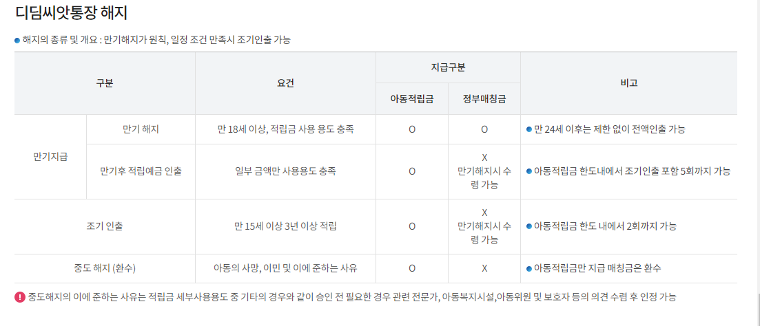 '디딤씨앗통장'은 아동의 재정적 자립을 위한 좋은 기회입니다. 하지만 만약 아동이 더 이상 이 프로그램을 이용할 필요가 없거나, 다른 목적으로 자산을 사용하고 싶다면, 위의 방법으로 해지할 수 있습니다. 자세한 내용은 복지로([4]) 홈페이지나 행정복지센터를 참고하시기 바랍니다. 감사합니다. 😊
