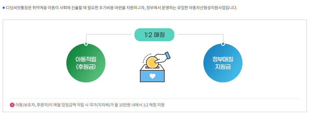 - 디딤씨앗통장은 아동이 보호자나 후원자의 도움으로 매월 일정 금액을 저축하면, 정부나 지자체가 월 10만 원 내에서 1:2 비율로 매칭하여 지원합니다. 즉, 아동이 매월 5만 원을 저축하면, 정부나 지자체가 10만 원을 추가로 지원해 주므로, 월 15만 원이 적립됩니다.
