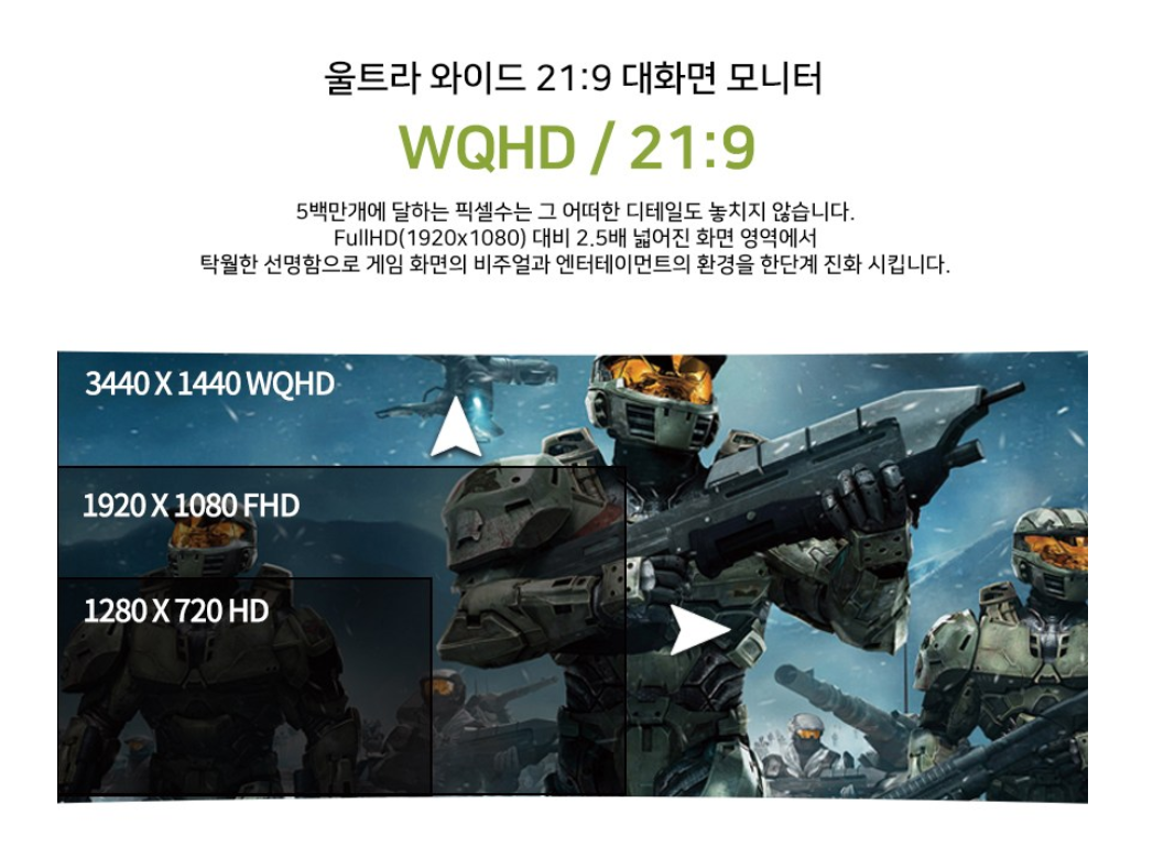 TFG34Q10W는 21:9 비율의 울트라 와이드(WQHD, 3440x1440 해상도) 화면을 제공해요.