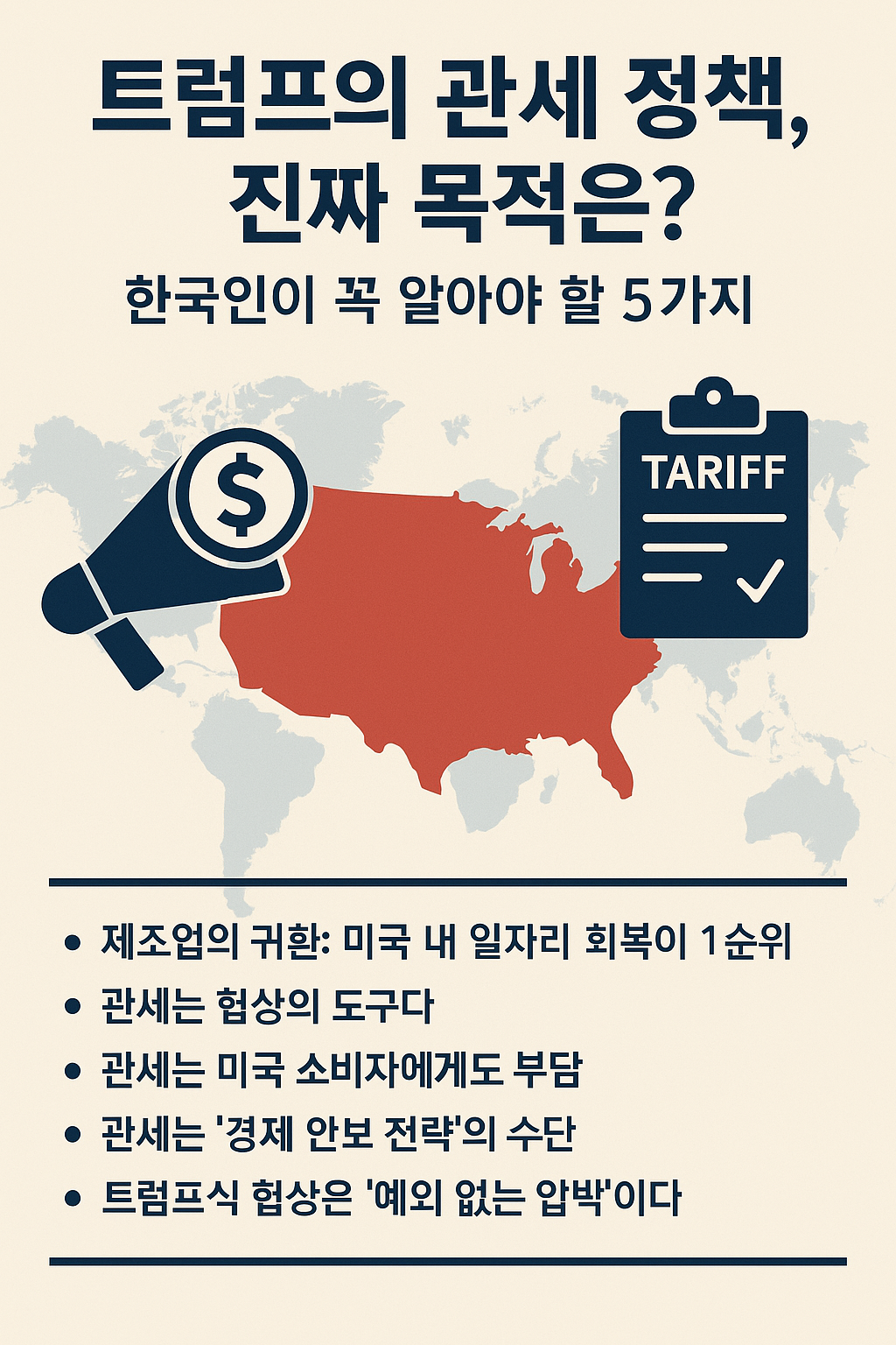 특히 2025년 대선을 앞두고 트럼프가 다시 관세 부활을 선언하면서, 한국 기업과 정부, 나아가 소비자도 이 흐름을 정확히 이해하고 대비할 필요가 있습니다. 다음은 한국인이 꼭 알아야 할 트럼프 관세 정책의 본질 5가지 포인트입니다: