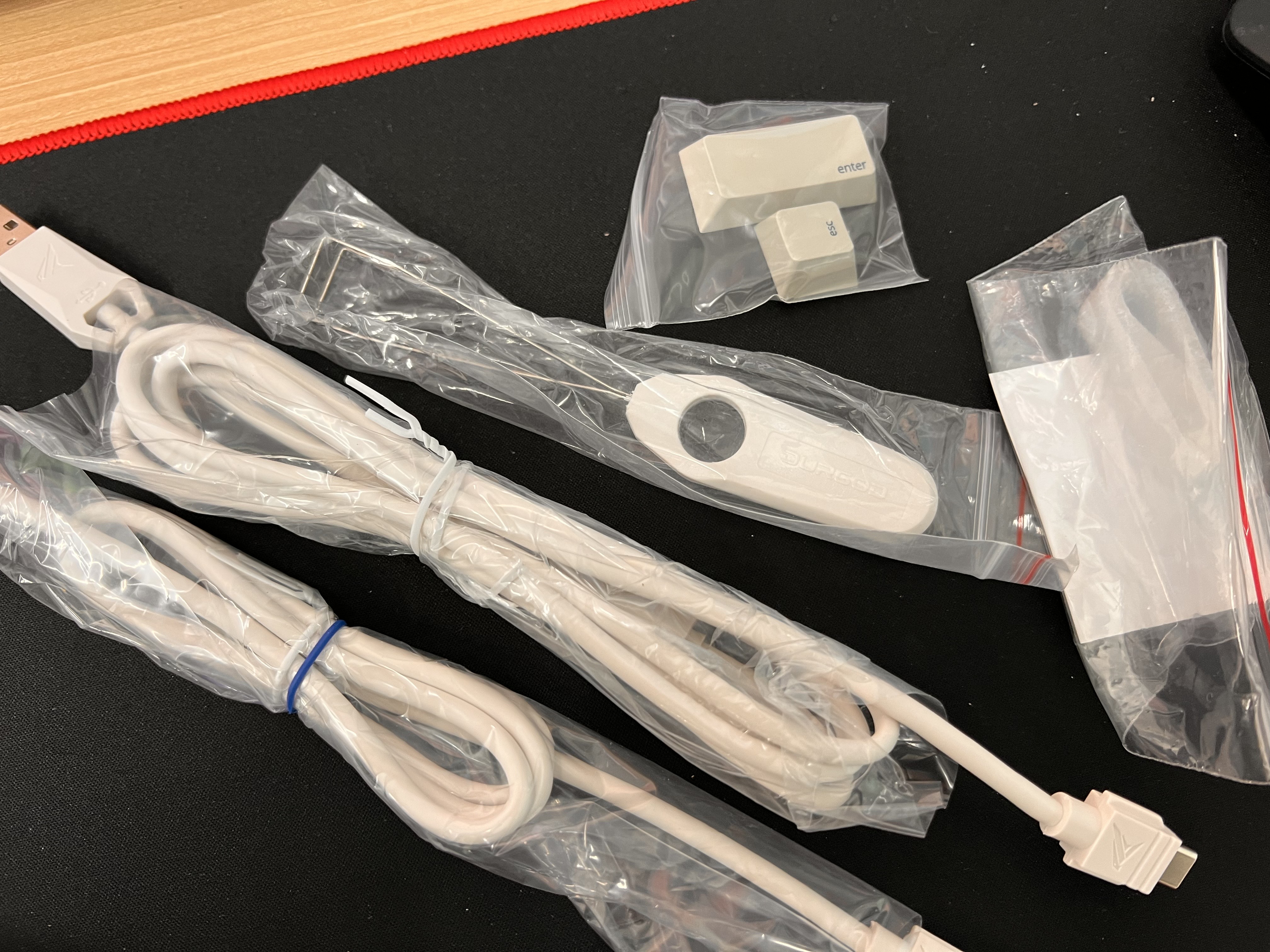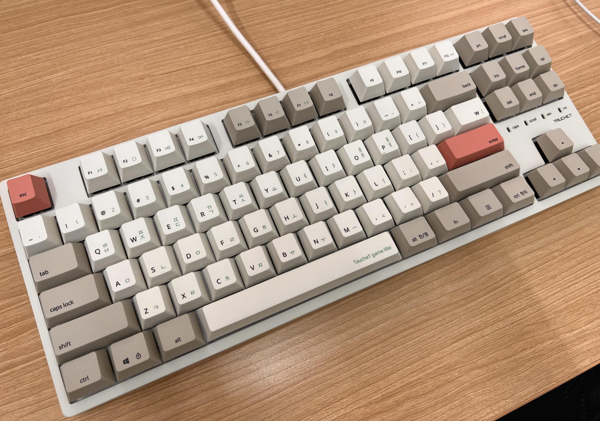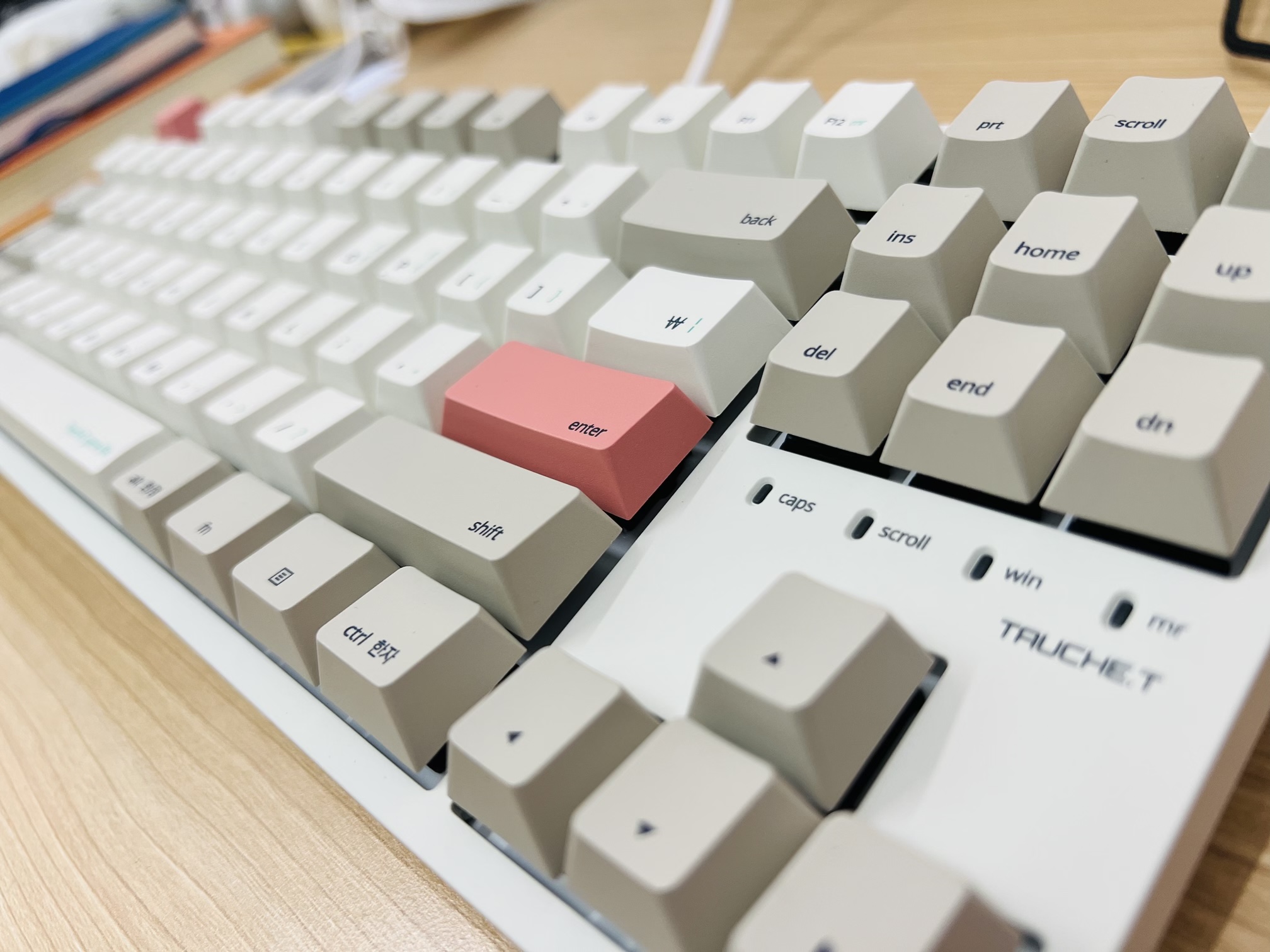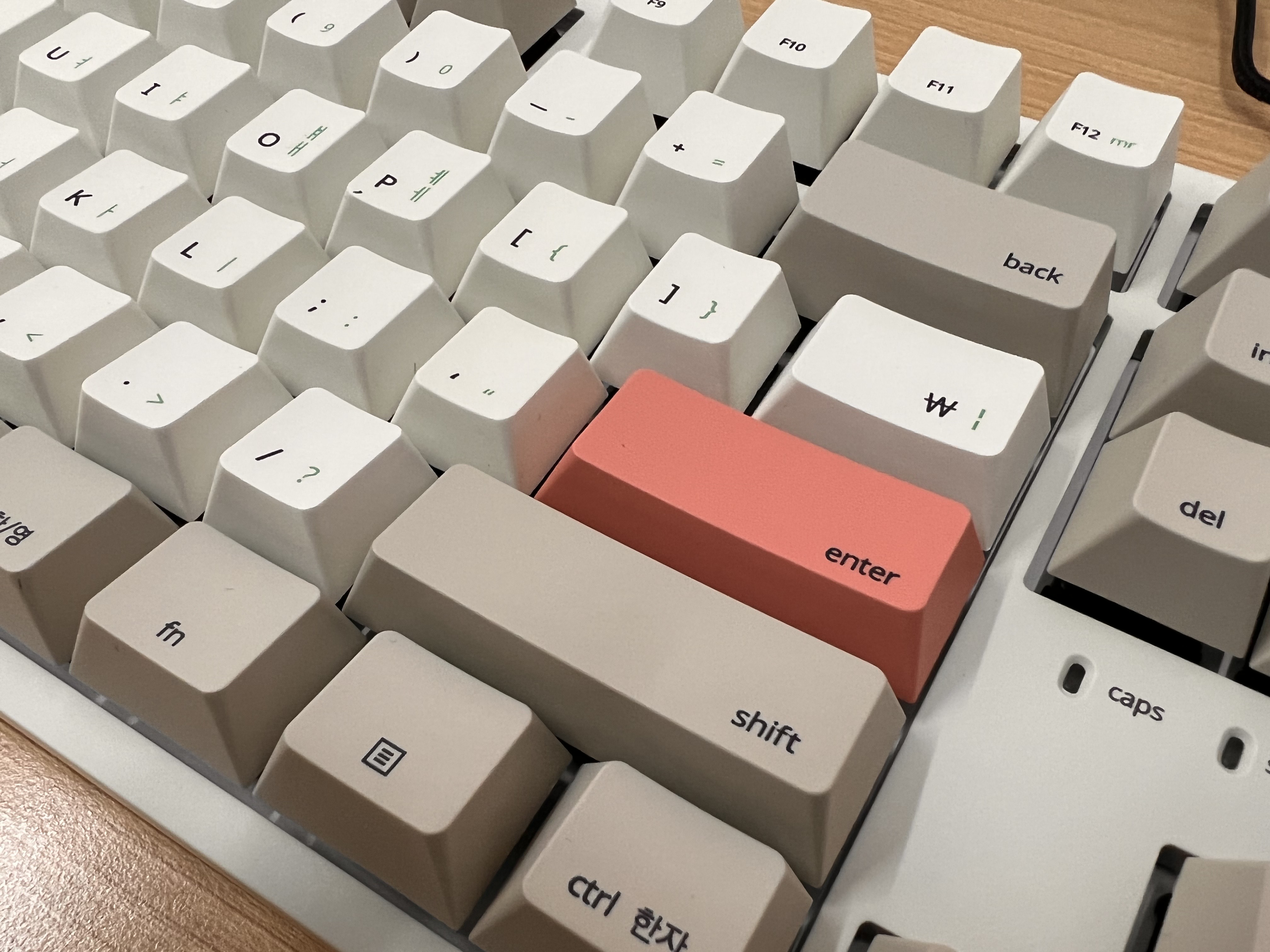 짜잔~ 컬러는 웜베이지 입니다. 레트로 키보드 느낌의 컬러가 좋았고 연핑크 포인트 키캡 디자인도 맘에 들었습니다. 연핑크 키캡이 싫으신분은 순정컬러의 여분키캡과 키캡을 뺄 수 있는 도구까지 같이 들어있어서 쉽게 교체가능합니다.